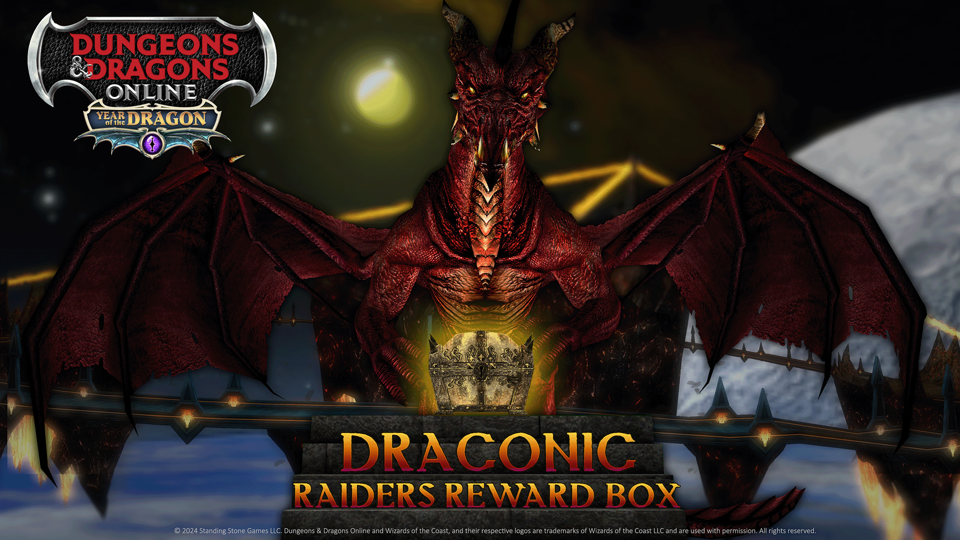 Unleash the power of the dragon in DDO with the thrilling Draconic Raider's Reward Box, obtainable from Xatheral in the Eberron Hall of Heroes for a limited time! Choose from an array of dragon-themed legendary raid items, cosmetics, or rare crafting materials for one character per server. Don't let this chance to claim your draconic treasures fly away!