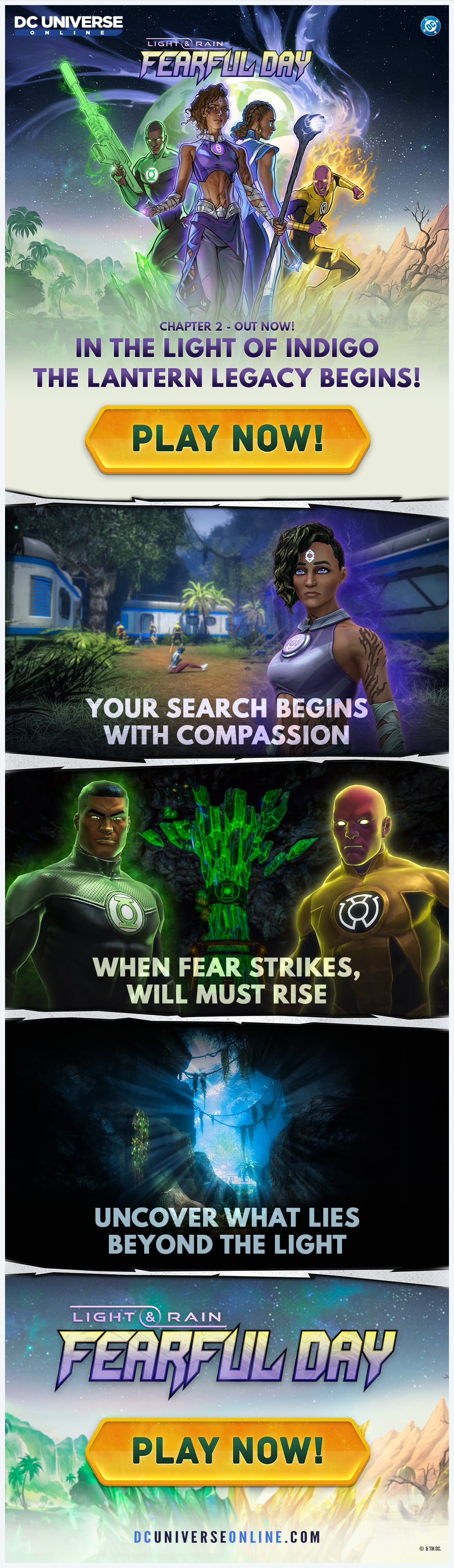 In the new solo instance Hidden Lantern Village, players journey deep into a secluded valley on Mogo, home to a peaceful Blue Lantern settlement. Joined by Indigo Tribe member Luzia Cavalera and Star Sapphire Carol Ferris, Heroes and Villains must search through the village to locate missing students from a Blue Lantern school. However, the serenity of the valley has been shattered. What dark influence has taken hold, spreading fear that paralyzes both Lanterns and civilians?